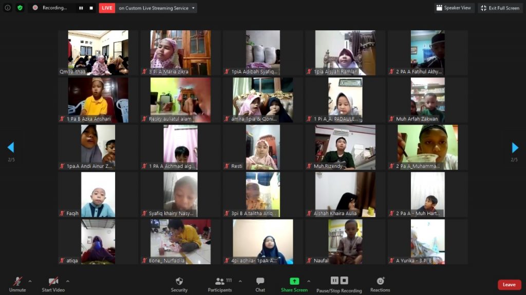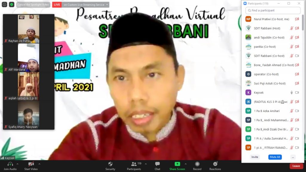 Tepat pukul 17.30 WITA acara pun dimulai dengan pembukaan oleh Andi Tajuddin, S.Pd selaku kepala sekolah SDIT Rabbani Bone. Beliau menyampaikan rasa syukur atas kelancaran kegiatan Pesantren Ramadhan Virtual tahun ini.